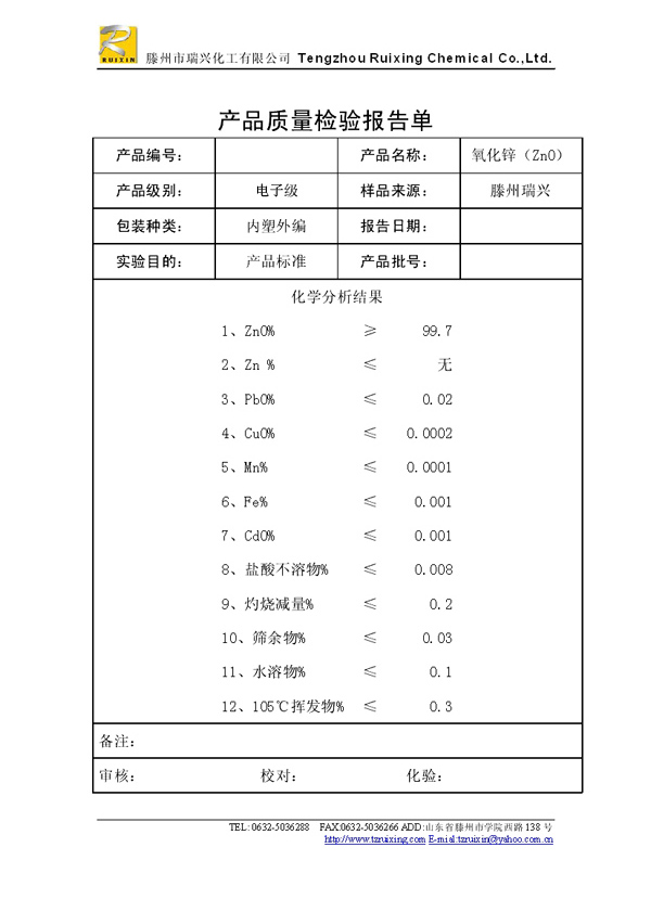瑞興化工有限公司是生產氧化鋅的重點企業,于2008年通過ISO9001:2008質量管理體系認證?!叭鹋d”牌氧化鋅在國內擁有較大穩定的市場,并遠銷東南亞、中東、中南美等國家和地區,在國內外享有較高聲譽。